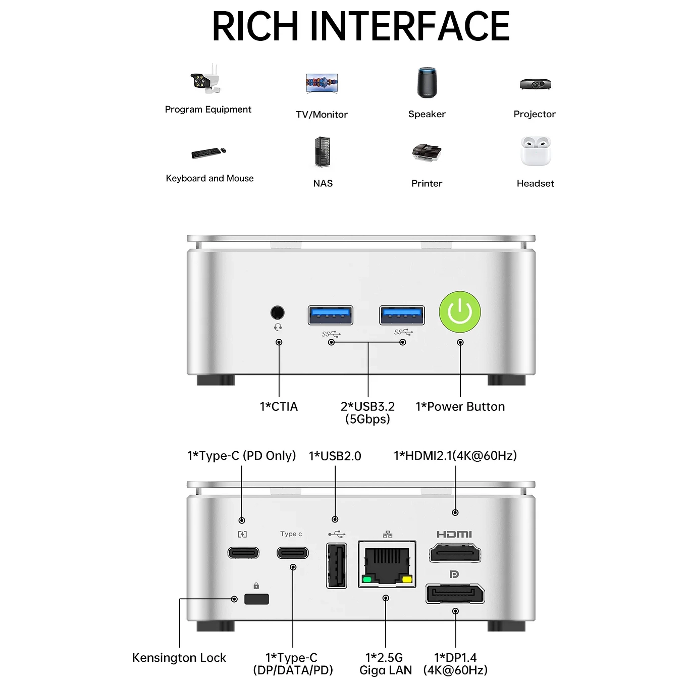 | Eksterni portovi | USB-A: 2× USB 3.2 Gen1 (5 Gbps) + 1× USB 2.0 Type-C: 1 (DP1.4 4K@30Hz + USB 3.2 Gen1 + PD) + 1 (samo PD) HDMI: 1× standardni HDMI 2.1 TMDS 4K@60Hz DisplayPort: 1× DP1.4 (4K@60Hz) Audio: 3,5 mm CTIA RJ45: 1× (Gigabit LAN) Taster za napajanje |