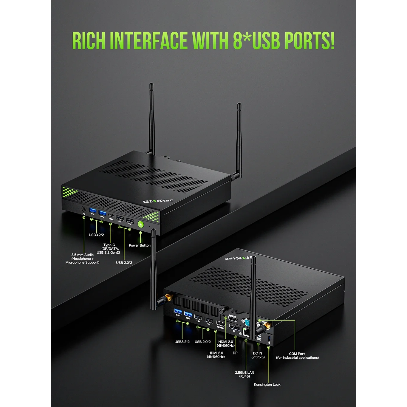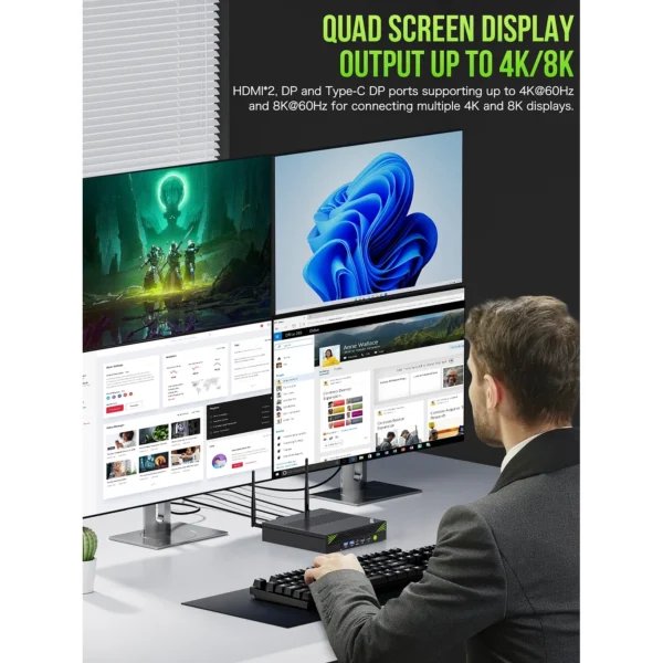 | Priključci | 2× HDMI, 1× DisplayPort, 1× Type-C (DP), 4× USB 3.2, 4× USB 2.0, 3.5 mm audio, COM port. |