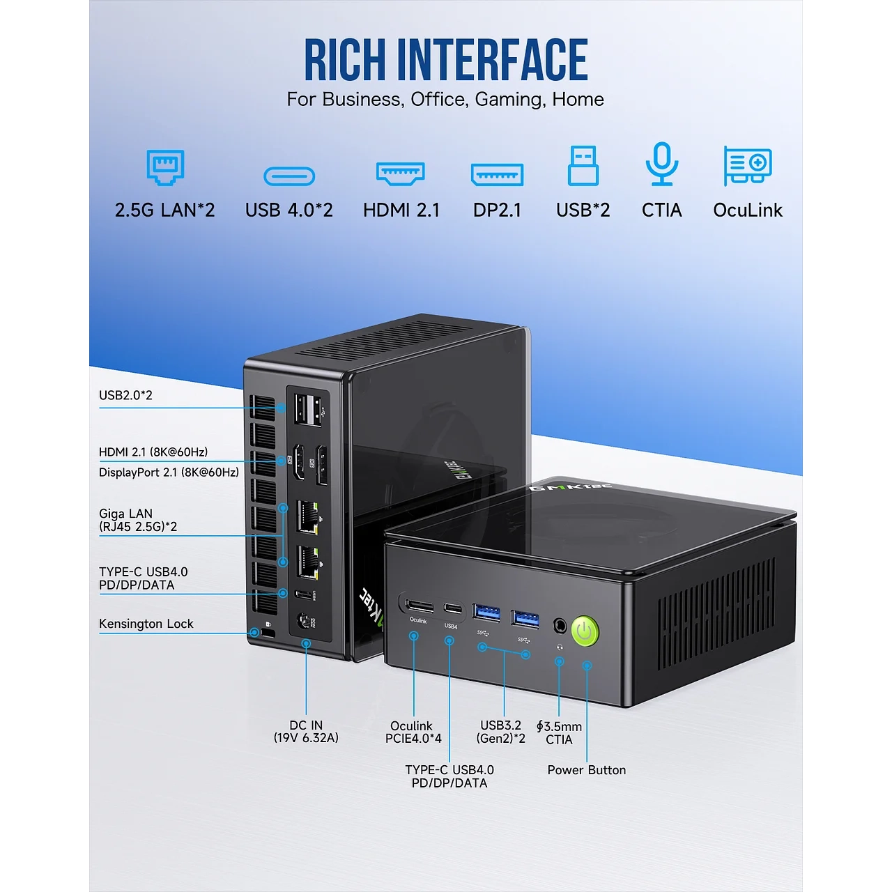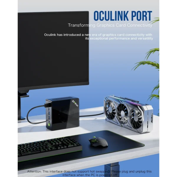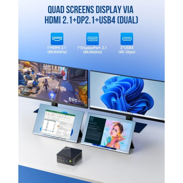 HDMI 2.1, DP 2.1, 2× USB4 Type-C (DP Alt Mode), OCuLink, USB 3.2 Gen2, Wi-Fi 6, Bluetooth 5.2 i 2× 2.5 GbE LAN.