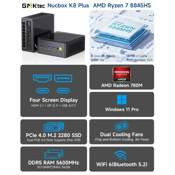 Mini PC GMKTec NucBox K8 Plus AMD Ryzen 7 8845HS, 32GB DDR5, 1TB M.2,WIFI ,VESA, Windows 11 Pro 60217